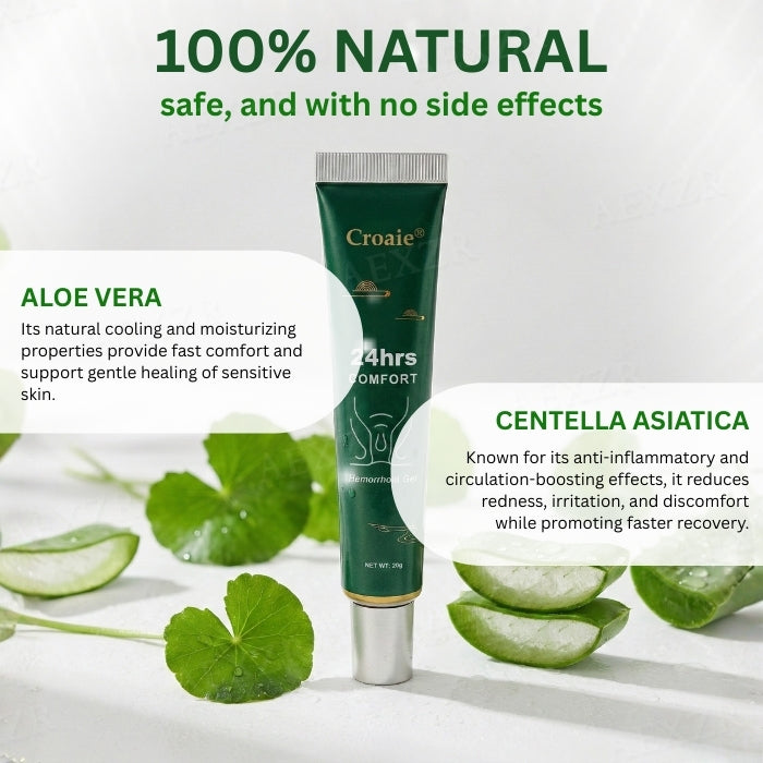 Croaie® 24-Hour Comfort Hemorrhoid Gel is made with 100% natural ingredients, ensuring a safe and effective treatment. It contains no petroleum-based chemicals, hormones, or harmful additives, making it the perfect choice for those seeking chemical-free alternatives. We understand the importance of natural remedies, which is why our formula includes powerful plant ingredients like Centella Asiatica and Aloe Vera, known for their healing and anti-inflammatory properties. No harsh chemicals, no side effects. By promoting tissue repair and vascular health, our gel helps prevent recurrence and maintains long-term anal health.